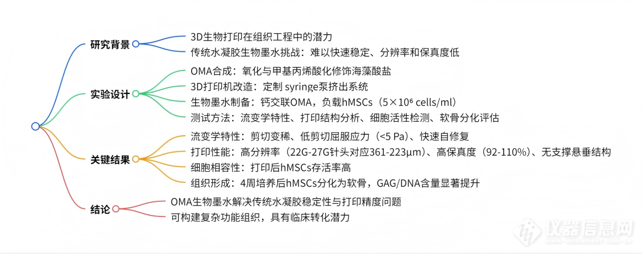 OMA 生物墨水经过剪切变稀、自修正和两层交联特性,处理了传统水凝胶的打印精度与安稳性问题。
